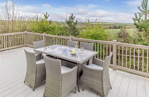 State of the art contemporary styled lodge with one master double, with contemporary en suite shower and two twin. Bathroom with bath with overhead shower. Spacious open-plan living space with 40" flatscreen TV and stylish modern kitchen with washing machine set beside an elegant dining area. Patio doors leading to spacious outdoor decking. Ideal for a holiday with family or friends to celebrate any occasion. No pets.
