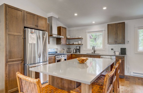 The living room is flooded with natural light, thanks to the large windows and light décor. Cozy up on the sofa and warm your toes by the fireplace while watching a show on the smart TV. This modern mountain retreat is the perfect place for your group to relax after exploring the stunning outdoors.