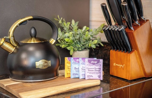 The fully-equipped kitchen boasts modern amenities making it easy to prepare delicious meals or a romantic dinner. Well-appointed with a full-sized refrigerator, dishwasher, stove, microwave, and other kitchen appliances perfect for making breakfast, lunch, or dinner throughout your stay! All pots, pans, glasses, plates, silverware, etc. are also there for you! Gather around the inviting dining table or the nearby breakfast bar to share stories and laughter as it invites you to savor each bite while taking in the natural beauty of the surroundings.