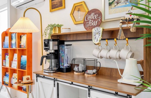 13. Coffee Station w/ hot water Kettle, Keurig Pod Coffee Maker. Starbucks pods