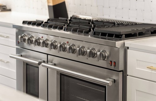 The heart of the home is the full chef’s kitchen, featuring a gas 48" 6-burner double oven range and a spacious 60" side-by-side refrigerator. A private pantry with an ice maker, espresso machine, drip coffee maker, and all the necessary cooking appliances makes preparing meals a delight. Share your culinary creations around the grand 10-foot-long dining table, which seats 12 and makes for the perfect gathering place. Fully stocked with champagne flutes, wine glasses, top end cutlery and plating, tumblers, and everything to be expected in a high end home.