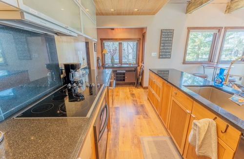 Windows surround the upstairs living/dinning area and kitchen keeping it bright and sunny. Insulated shades throughout the house for privacy and energy efficiency. Wood burning stove is located in the living area, which has TV with Amazon Firestick, dvd player, board games and wi-fi.