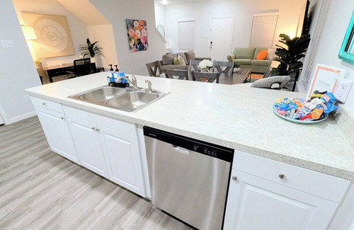 The fully equipped kitchen features cookware, kid-friendly dishware, basic spices, and appliances including a K-Cup coffee maker, toaster, and blender. Whether you're whipping up breakfast or a full family dinner, you’ll have everything you need.
