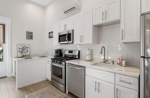 Our Carriage House kitchen is fully equipped with full-size appliances, including a gas range and oven, microwave, and dishwasher. A commercial ice machine is conveniently located in the main house, with unlimited bagged ice provided for your use. There is no need to purchase ice during your stay.