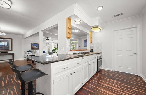 A formal dining area located between the kitchen and the living room is a great place to serve a family-style dinner. When not eating here, the table is a great spot to play board games or cards, or open up your laptop, connect to the high-speed WiFi, and get some work done before heading out for a day of shopping.