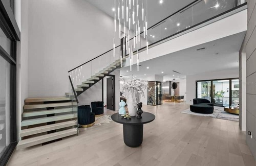 As you enter, you'll be greeted by a grand entrance with 24-foot ceilings and a striking floating staircase. The expansive dining room, complete with a wine cellar, sets the stage for memorable dinners. The chef's kitchen is a culinary dream, featuring Calcutta Marble countertops, state-of-the-art Thermador appliances, and a hidden pantry for extra convenience.
