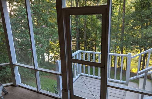 The main house was renovated in late 2020 / early 2021 with the removal of popcorn ceilings and old wallpaper, brand new kitchen appliances, huge new TVs (including an 82" 4K in the great room/dining room), front load washer/dryer, new mattresses and linens, dual hood grill, ceiling fans, bathroom fixtures, paint, etc - before putting it on the market for rentals. For most renters, the highlight is the great/dining room with a massive 13' long bespoke oak table and huge windows overlooking the water. The attached screened in gazebo (directly off the breakfast nook, with benches and a large table) is ideal for quiet work, reading, or just sipping wine and listening to the sounds of the woods and the lake at night. Multiple decks with rocking chairs and tables, as well as the fire pit surrounded by Adirondack chairs make for a great place to relax and catch up with friends and family.