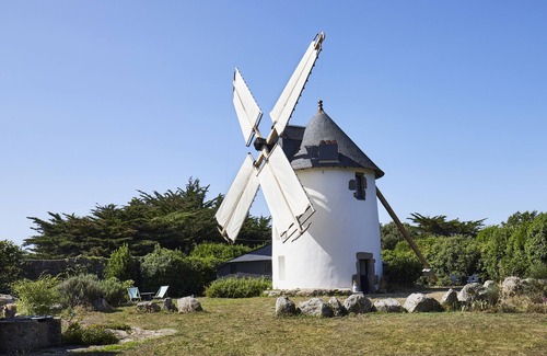 Enjoy the charming setting of this atypical accommodation immersed in nature. In a traditional windmill labeled Fondation du Patrimoine and Vieilles Maisons Françaises (VMF), you will enjoy a timeless stay in a space offering both traditional authenticity and complete comfort. With several views of the sea and the countryside, your room will allow you to contemplate the original frame and mechanism In a windmill dating from 1808, with a small adjoining building, you will enjoy, spread over 46m2, on the ground floor, restored in 2022: a living-dining room paved with granite stones, as well as a kitchen with all the modern conveniences, a bathroom and separate WC. An open granite staircase leads to the upper floors. On the first floor there is a small sitting room which also serves as a study and library overlooking the garden. The double bedroom is on the second floor, the highest living area on the island, with views over the countryside, harbour and sea. The room opens visually onto the mill frame and its original mechanism. There is a garden at the foot of the house, surrounded by meadows and greenery. The mill has all its authentic aspect, but with a layout that respects its history and is adapted to contemporary living requirements. You will have private access to the entire mill and to the garden. Passionate about the island, the mills and this emblematic place, I will be happy to share with you its history and some of its secrets. In the centre of the island, 5 minutes walk from Ker Châlon beach, the site is a protected natural area, and allows easy access by bike to all the beaches and shops on the island. The mill is currently undergoing a restoration of its wings in order to be able to turn again and produce its own electricity.