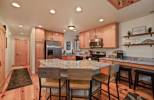 Rudolph Resort has custom wood features, including wood floors and vaulted ceilings with a wall of windows looking out to the Blue Ridge mountains. The open-concept living area centers around a stacked stone fireplace with an HDTV and cozy leather seating. The kitchen/dining area has stainless steel appliances, granite countertops, and accommodates 11 guests. The Master King bedroom is on this level and has a full ensuite bathroom with a separate soaking tub and walk-in shower. There is also a Queen bedroom with a shared full bathroom with a shower.