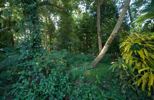 The retreat is located on the banks of river Periyar, the largest river in Kerala, South India. It is nestled in a garden of mainly nutmeg, with several other varieties of trees and plants, providing a cool environment.