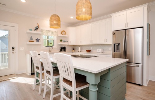 Enter a world filled with bliss planted in the middle of an island paradise. Enter A Swell Life and vacation like you’ve never vacationed before. This home welcomes you and one dog to frolic by the sea and soak up the sun. Utilize the bicycles and take the five-minute ride to the beach. Need a change of scenery? No worries! The Intracoastal Waterways is only a two-minute bike ride away. When you want a break from the salty sea, enjoy a seasonal private pool and play some water games with your loved ones.