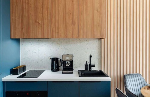 The bedroom has a comfortable queen size bed. The living room has a large sofa and a place to spend cozy evenings. The bathroom consists of a shower and a toilet. The apartment is also equipped with a kitchen equipped with all necessary appliances - induction hob, dishwasher and oven.
