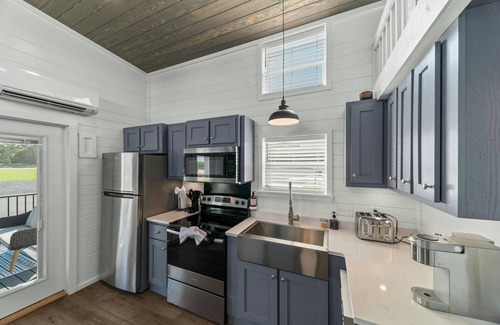 A Walk In The Clouds is true to the name as it rests in the highest group of homes on the ridge. This hill top tiny home can nearly touch those white fluffs as they float by. Here, you're truly reminded of why the Texas hills are so magical. This home offers plenty of parking, an enormous screened in porch with outdoor seating, and can sleep six adults and two children. Swing open the french doors and expand the already spacious living area. The half bath in the hall provides additional convenience for your group. The downstairs master has a queen bedroom with a full on-suite bath. There is also a set of bunk beds in the downstairs hall. Upstairs provides two queen beds that can comfortably sleep four. Come gaze at the stars, try to cloud float through your fingers, and enjoy the rolling hills.