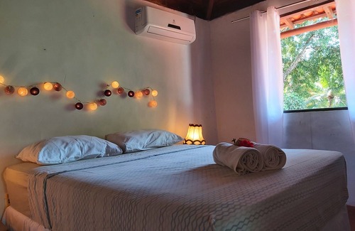 House in a comfortable, cozy environment, with lots of green space, 5 rooms with air conditioning, box bed and windows overlooking nature, two suites. Living room, kitchen and large bathroom with hot shower. Great location: between Ponta do Muta. and the village, just 100 meters from the beach!