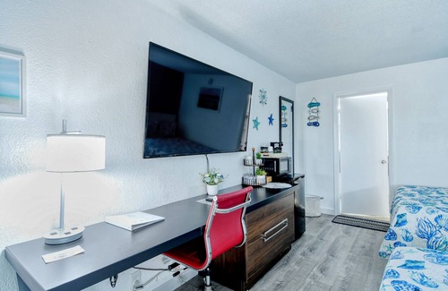 All-New & Updated Hotel Room-Condo at the Ramada Inn on 41. Ground-floor, Two large, comfy Queen beds, 70" smart TV w/ cable channels, strong WIFI. All-New Shower, Vanity, Coffee/Tea bar w/ fridge and microwave. Heated Pool, Tiki Bar and Grill with daily meal and drink specials. Live music too! Beautiful Marina steps from your door...Bring your boat or rent one! Minutes drive to SRQ airport, USF, New College, IMG Academy, Downtown Sarasota, St. Armand's Circle & All area beaches!