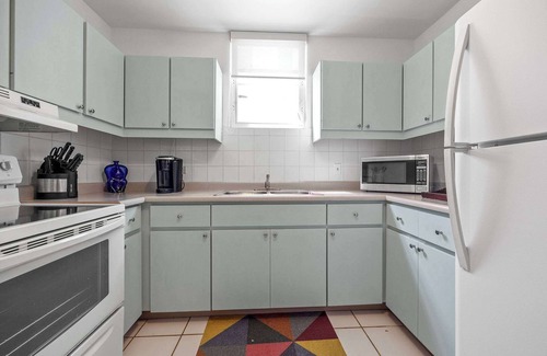 The kitchen at Aloha Coquí is thoughtfully tucked away from the main living areas, offering a private space for meal preparation. It is completely equipped for an extended stay with a fridge, freezer, microwave, stovetop, oven, coffee maker, and toaster.