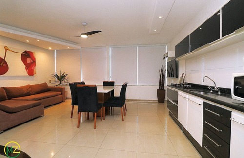 Huge living room with spacious and comfortable sofa, ceiling fan, dining table with 6 chairs, SmartTV and a beautiful view of the beach through the large windows. Attached to the living room, we find a beautiful kitchen with a 4-burner cooktop, refrigerator, microwave and basic cooking utensils.