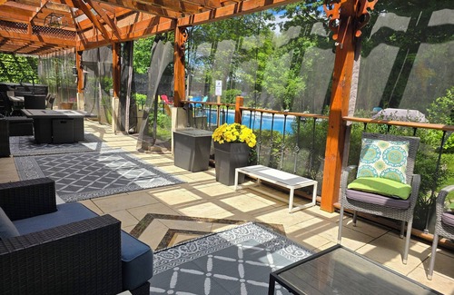 - The house is situated within the city of Montreal, neighboring Beausejour Park, which is accessible from the garden via a private gate. It features a terrace with a stunning river view, a garden, a hot tub that accommodates 10 people on the covered terrace, an outdoor kitchen, a large BBQ, and a heated pool. The house contains 8 bedrooms with a total of 14 beds: 1 king-size, 6 queen-size, 4 full-size, and 3 twin beds. Seven bedrooms come with their own en-suite bathrooms. Additionally, each bedroom is equipped with an individually controlled smart TV, offering access to personal Netflix, YouTube, etc.