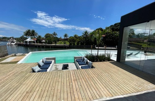 Delightful, modern, rustic house, on the edge of the canal in Condomínio Porto Bracuhy, inaugurated on 12/30/2022, all new, 5 suites, 4 of which facing the canal, beautiful views, queen size beds, and a suite with views street, private floating deck for small and large boats with 70 amp socket (4 pins), 90m2 resort pool, dry sauna with canal view, bathtub for 8 people with canal view, full kitchen, barbecue, small beach, fire pit with glass display for the pool, beautiful view of the whole house. Rent a speedboat and leave the house's private floating deck for a tour of some of the 2000 beaches and 365 beautiful islands. Surprise yoursel