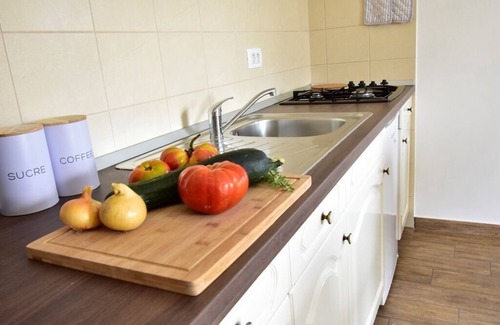 There is a studio apartment for 2 persons and a larger apartment for 4-5 persons. Wi-Fi and private parking, a children's pool (4x4m, 70 cm deep) are available free of charge. Both apartments have satellite TV , a kitchenette with microwave , fridge, kettle, hob and a private furnished terrace with direct access to the large garden. The bathrooms are equipped with shower and hair dryer. A small food market is only 100m away. The nearest restaurant 300m. The friendly landlords are organic farmers where you can buy organic vegetables.