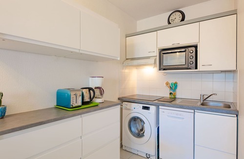 2-room apartment 40 m2 on 2nd floor. Practical and beautiful furnishings: living/dining room with 1 pull-out bed (2 pers. 2 x 80 cm, length 190 cm), TV and electric shutters. Exit to the terrace. 1 room with 1 french bed (160 cm, length 190 cm). Kitchenette (mini-oven, dishwasher, 3 ceramic glass hob hotplates, toaster, kettle, microwave, freezer, electric coffee machine). Bathroom, sep. WC. Electric heating. Small terrace 11 m2. Terrace furniture. View of the swimming pool. Facilities: washing machine, hair dryer. Internet (WiFi, extra). Garage space n 7132, height 185 cm, width 252 cm. Please note: non-smokers only. Smoke alarm.