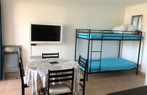 Apartment located on the 1st floor including: a living room with a kitchenette, 2 bunk beds of 90, a sleeping area with a bed of 140.