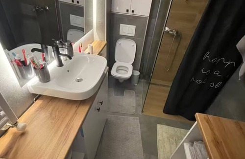Stylish city-center modern apartment with glass partition and cozy urban vibe – perfect for exploring Skopje.