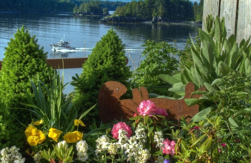 The property is surrounded by vegetable and flower gardens, including the elusive Himalayan blue poppy. Throughout our home, you'll discover many examples of Marion's artwork, including photographs (printed on metal) and mosaic pieces. It's not unusual to hear bald eagles screeching nearby or 'exhale puffs' from sea lions, humpback whales, or orca whales as they swim by.