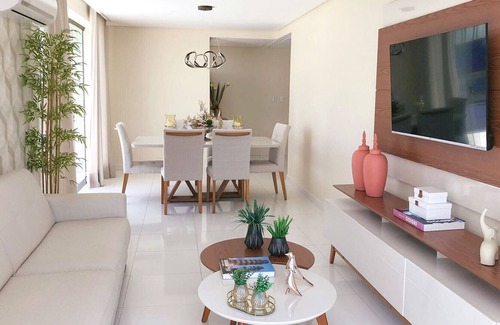 - Na sala você encontra sofá, Home com painel, aparador e mesa de centro