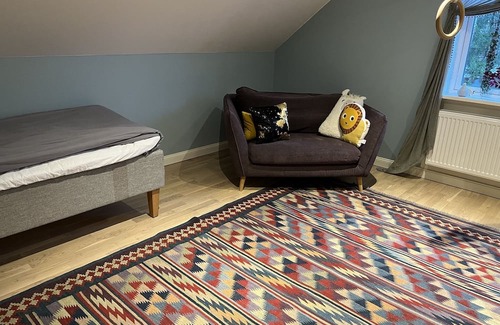 Upper floor offers 3 bedrooms and a family room with TV (Apple TV). Two bedrooms with one single bed in each room and one with a daybed that can be pulled out to a double bed. There are also two mattresses that can be put on the floor.