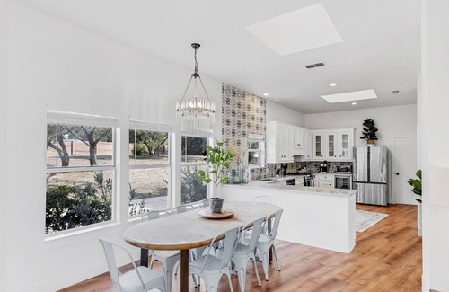 Stylish hill country getaway with amenities galore. This home features 6 bedrooms, 3 large bathrooms with plenty of getting-ready space, open floor plan, and views for miles. Outside you'll find a large covered deck that overlooks the greenbelt with magnificent sunsets and sunrises. You'll enjoy our sparkling pool and spa with a swim deck for lounging around. When the sun goes down you'll be gathering around the fire pit with family and friends!