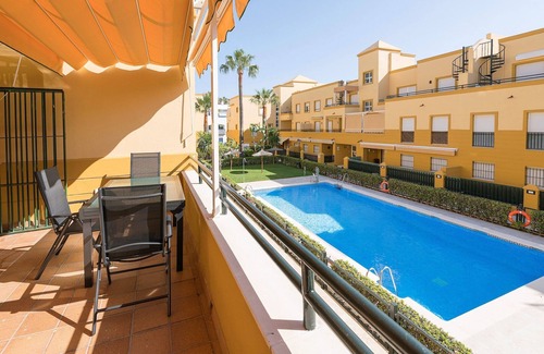 Outside, there is a large shared pool measuring 20 meters long and 10 meters wide, which is fenced as a safety measure for the little ones, and surrounded by the communal garden. Inside the apartment, the furnished terrace becomes the ideal place to relax after a day enjoying the sea and the good temperatures. The cozy and bright apartment is located on the first floor of the building, which has an elevator. Inside, the living-dining room is equipped with air conditioning, and Smart TV for the entertainment of guests. The kitchen has a ceramic hob. You will also find a laundry area with a washing machine, iron, and ironing board. The house has two bedrooms, both equipped with air conditioning. The master bedroom offers a double bed and a cot available, while the second bedroom has two single beds. The extra guest can sleep on the sofa bed in the living room. There are two bathrooms with a bathtub, one of them en suite. Costa Ballena, located in Rota, Cádiz, is a beautiful urbanization that combines the natural beauty of the Costa de la Luz with first-class facilities. Its golden sandy beaches and crystal-clear waters invite you to relax and practice water sports. It also has a wide range of services, including hotels, gourmet restaurants, shops, and leisure activities, ensuring an unforgettable holiday experience for those seeking luxury and comfort by the sea. The communal pool is only available during the summer season. Consult the advertiser for possible charges. Pets are not allowed. The holding of events is forbidden. There are parking space for 1 cars in the garage. Please note that the opening and closing dates of the communal pool are subject to community regulations and may vary depending on the season, without prior notice. Updated information will be available upon your arrival. Distances Beach: 0.450 km - Playa de la Ballena Airport: 41 km - Aeropuerto de Jerez Golf course: 2.1 km - Costa Ballena Ocean Golf Club Town: 11.4 km - Rota Train station: 30.8 km - Jerez de la Frontera Bus stop: 0.350 km - Costa Ballena Ferry: 45.8 km - Cádiz Hospital: 31.8 km - Hospital Jerez de la Frontera Tourist license: VUT/CA/19378Single Rental Registry: ESFCTU0000110230002734540000000000000000VFT/CA/193786
