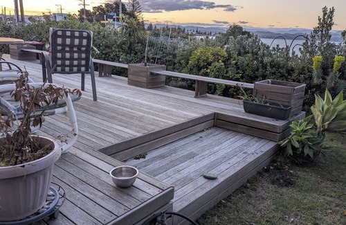 This quintessential kiwi batch has panoramic ocean views even from bed, a large deck and a private spa. Close to the airport, excellent restaurants and night life.