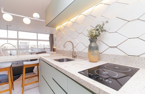 With an incredible location and unique design choices such as a beautiful bubble swing and a bathtub strategically facing the city view, the studio is in front of the new and recently revitalized Vale do Anhangabaú, where it is easy to explore the historic center and the surroundings, from one of the most effervescent points in the heart of the city of São Paulo.