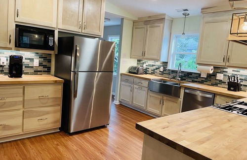 CasaVerde interior features a modern take on a mid-century, coastal design. Numerous upgrades have been made to make your experience comfortable and enjoyable. The custom kitchen is well stocked for the chef in your party. The up-to-date bathrooms feature nice finishes. The home has three smart-TVs and Wi-Fi. The luxurious primary bedroom features a king bed, smart-TV, walk-in closet, soaking tub, luxurious shower with dual showerheads and direct access to the screened in porch with the hot tub. The second bedroom accommodates 4 guests with two queen-size beds and a walk-in closet. The third bedroom can accommodate up to 5 guests with full over full bunk beds and a single trundle bed, and offers a smart-TV.