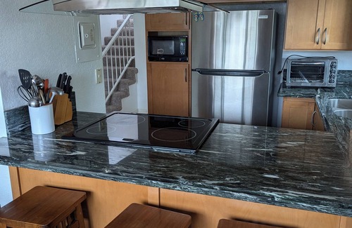 Enjoy a beach holiday year round in this spacious, fully-furnished apartment with a completely outfitted kitchen with dishwasher and granite countertops. Clean leather furniture in living room.. Also included is new split unit air conditioning and heating downstairs, Smart TV so you can stream TV shows and movies, DVD player, wireless high-speed internet, shared coin laundry facilities in the garage, and garage parking for smaller car. Additional TVs in Master bedroom and queen bedroom and DVD player/TV in bunk room.
