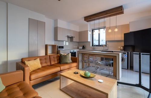 The kitchen is a joyful mix of style and function. Modern appliances meet open shelving and soft pendant lights to create a space that inspires—whether you're preparing a family meal, crafting a Greek salad, or brewing a quick espresso. A stove, oven, microwave, dishwasher, washing machine, and all your essentials are thoughtfully included, making each stay feel easy and complete.