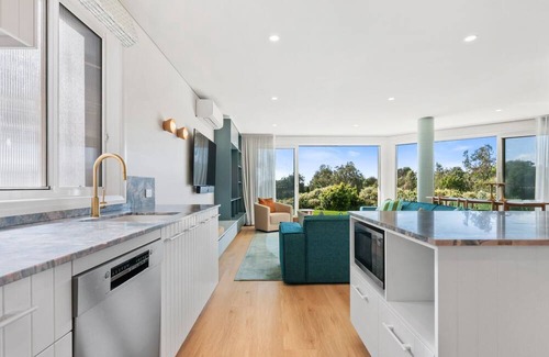 The fully equipped kitchen flows into an open-plan dining and living space, filled with natural light and designed for easy holiday living. Large windows bring the outdoors in, showcasing the natural beauty of South West Rocks throughout the home.