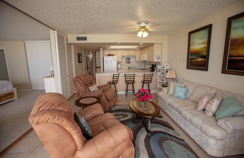 This 1,050 SF 2-BR 2-Bath condo sleeps up to six, with king bed in the master, a queen bed in the guest bedroom, and if needed, a comfortable queen sofa-sleeper in the living room.