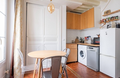 Original terracotta tiling brings a distinguished mood to the modern kitchen which plays host to key amenities including a fridge, freezer, oven, hob and washing machine. Presenting a refined view across a street rich in Hausmann-inspired architecture, the dining table offers space for four guests.