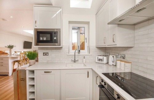 Upon entry, you’ll step into a bright, open-plan living and dining area bathed in natural light from the stunning skylight above. The large island offers a social space for dining and entertaining, complete with handcrafted wooden high stools. A spacious L-shaped leather sofa provides the perfect spot to unwind after a day of sightseeing in York. There’s also a desk and chair for those needing a work-from-home or office setup, along with a wall-mounted smart TV.