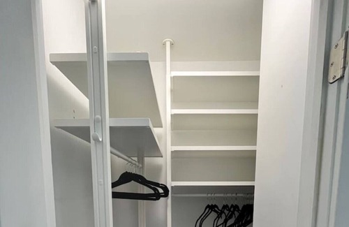 The secondary bedroom is on the back side of the apartment and doesn't face the street. It also has a queen bed, black out shades and a large closet with shelves and hanging space. A second bathroom with shower is located next to this bedroom.