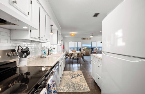 Unit 029 Eventide Cottage - If you are dreaming of the perfect quaint beach cottage for an island getaway right here in Alabama, this is it. This home gives you the full experience. Private dock on the Mississippi Sound provides fishing or sunning opportunities while the kids can play nearby on the soft white sand, shaded most of the day to protect their skin. Lovely gated grassy area at the base of the steps allow four-legged family members to walk a bit and still have porch access. The North facing porch offers grand views of the sound and Dauphin Island Bridge. Porch swing and lounging area make for the perfect setting to enjoy the view or watch the others below. Inside you will find a delicious décor that is both relevant and classic, and perfectly beachy. Long, authentic wood dining table accommodates the whole clan for togetherness time. Absolutely charming kitchen comes with every tool you'll need, with stack washer/dryer behind. Comfortable furnishings at the flatscreen satellite tv complete the open floor plan. Master Suite has sweeping gulf views, queen bed, and tons of natural light. Behind the rustic yet chic sliding barn door you'll find the 2nd full bath on the way to the 2nd and third bedrooms. Children will love climbing the colorful stairs to their beds in the bunk room, and other guests will love the quirky creativity in the 3rd bedroom with queen bed.