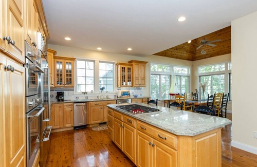 Beautiful 4-bedroom New Seabury home within walking distance to 2 beaches and a short drive to Popponesset, Mashpee Commons and Falmouth. Jump off the dock for a swim, fish or kayak right from the dock! Enjoy hanging on the deck with amazing water. views. A different sunset paints the sky every evening. This custom-built home has dramatic floor-to-ceiling windows that showcase the water’s glistening canvas and sunsets from most rooms. More than accommodating for groups up to 10 people. There are two Primary Suites with full baths (1 up, 1 down). Another bath is shared by 2 more bedrooms and a plus/bonus room. There is a half bath on the first floor. Sun/dining room with walls of glass exits to the deck, and the den/office offers escape or workspace. A complete coastal paradise.