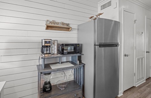 The living space is bright and inviting, with a comfy couch that's just begging for you to curl up with a good book or enjoy a movie night after a day at the beach. The kitchen is fully equipped, so whether you want to whip up a romantic dinner or just brew some coffee at the coffee bar, you've got everything you need at your fingertips.