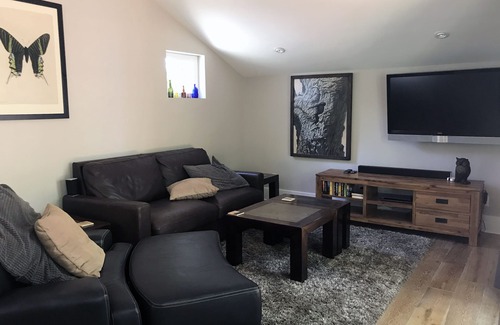Whether kicking back in the high-ceiling living room or hanging out on the private deck, you'll get a wonderful view of the lush grounds of this property. A spacious kitchen allows you to prepare snacks and meals on those (perhaps rare) occasions when you want a break from Murphys' wonderful restaurants, and the downstairs bedroom, with king bed, gives you peace and solitude to slumber after a busy day at the wineries.