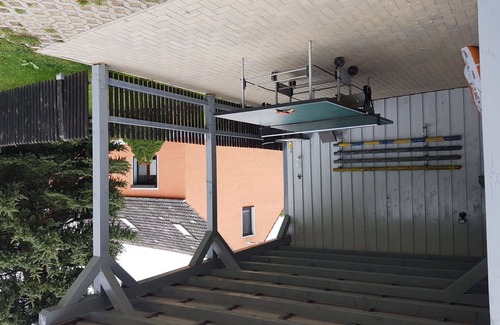 Upstairs, accessible via a steep staircase, you'll find a room with sloping ceilings, featuring one bed measuring 140 cm by 200 cm, one double bed measuring 180 cm by 200 cm, and a flat-screen TV. Another room on this level has one bed measuring 140 cm by 200 cm and a sleeping facility measuring 80 cm by 180 cm. There is also a playroom on the upper floor.