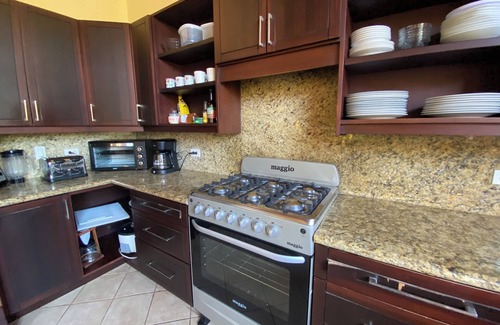 The main house offers a full kitchen with ALL appliances and utensils for cooking and for preparing your favorite cocktails, a spacious living room with two sofas and one chair to have your family gatherings, we offer an inside dining area with a table and an outside dining table, a large patio with chairs and coffee table overlooking the gardens, the forest and the swimming pool. You can choose to eat inside or outside by the veranda. In this area we also offer a Weber barbecue if you feel like having a parrillada.