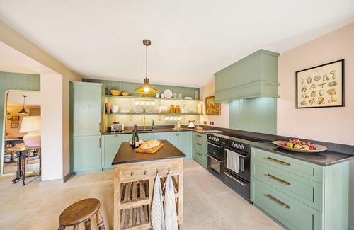 On the ground floor is a beautiful sitting room with handmade wallpaper, a brick feature wall and a wood burning stove, and it is the perfect space in which to relax and unwind, watching the Smart TV, and enjoying high quality sound from the recessed speakers. The hallway with cloakroom leads through to the well-equipped open-plan kitchen, and a generous dining room. The gorgeous handmade kitchen is the ideal space for preparing delicious meals using the range cooker, with plenty of counter top space and storage. The dining room has a large circular table with plenty of chairs, and invites you to relax and linger after enjoying your meal.