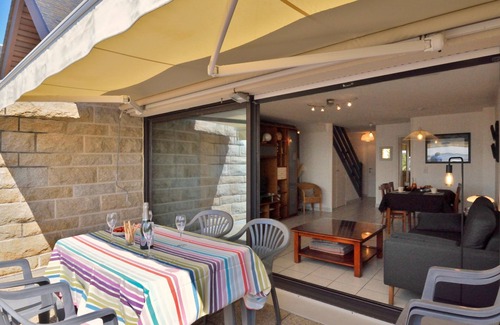 "Belle Vue Mer et Groix", 3-room apartment 70 m2 on 2 levels on 2nd floor. Bright, renovated in 2025: living/dining room with dining nook, TV, international TV channels and hi-fi system. Exit to the balcony. 1 room with sloping ceilings with 1 french bed (160 cm, length 200 cm). 1 room with sloping ceilings with 2 beds (90 cm, length 190 cm). Kitchen (oven, dishwasher, 4 ceramic glass hob hotplates, toaster, kettle, microwave, freezer, electric coffee machine). Shower/WC, sep. WC. Electric heating. Balcony 12 m2. Balcony furniture. View of the sea. Facilities: washing machine, iron, children's high chair, baby cot. Internet (WiFi, free). Please note: smoke alarm.